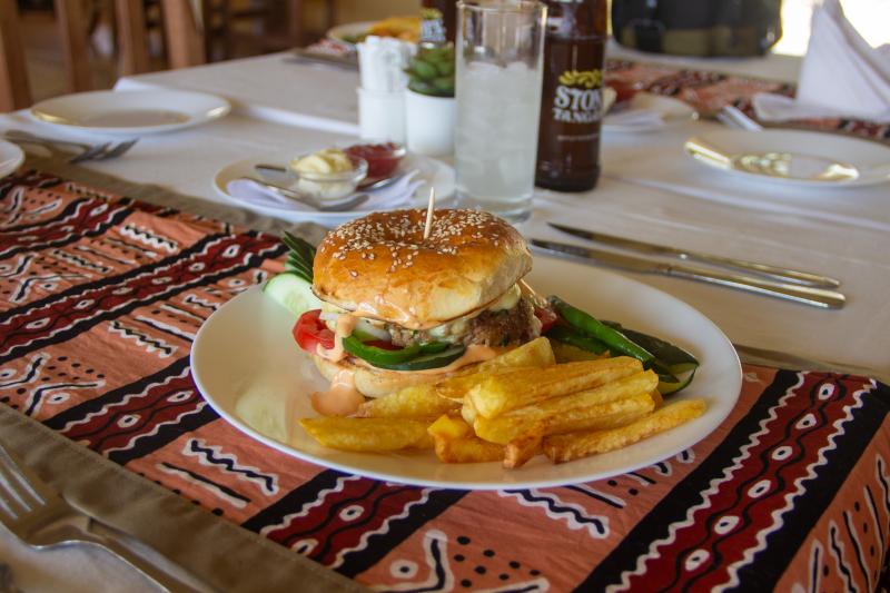 Die Küche der Lodge überzeugt mit frischen, lokal bezogenen Produkten. Die Gäste genießen sowohl internationale Gerichte als auch tansanische Klassiker. Besonders geschätzt wird das Frühstück unter freiem Himmel, bei dem man die Tierwelt im Tal bereits aus der Ferne beobachten kann.