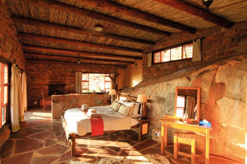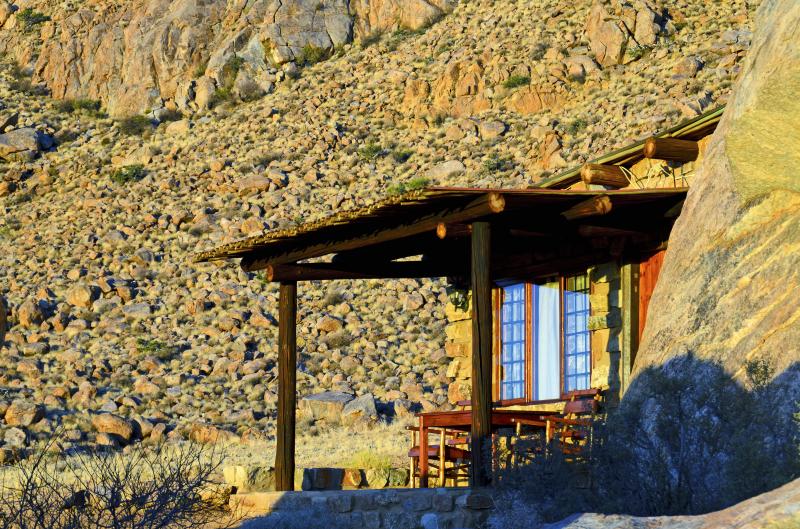LAGEDas einzigartige Ambiente der Eagle's Nest Chalets eignet sich perfekt für Urlauber, die einfach nur Ruhe suchen. Die Chalets liegen einsam auf einem Berghang, von wo man einen einzigartigen Ausblick in die unendlichen Weiten der Wüste genießen kann. Das Desert Horse Inn, wo die Mahlzeiten serviert werden, liegt etwa 15 Autominuten entfernt. Eagle's Nest ist ein idealer Ausgangspunkt für Ausflüge, beispielsweise nach Lüderitz oder die Geisterstadt Kolmannskuppe. | HOTELDie Chalets des Eagle's Nest liegen am Hang einer Bergkette, von wo aus man die Stille und die prächtigen Sonnenuntergänge über der scheinbar endlosen Wüstenlandschaft auskosten kann. Jedes Chalet ist aus Naturstein zwischen mächtigen Granitfelsen auf dem Hang gebaut. Die Mahlzeiten können im Desert Horse Inn eingenommen werden, oder es können auch Frühstück und Grillpakete von dort mitgenommen werden. In der Umgebung der Unterkunft gibt es eine Vielzahl an Wanderwegen verschiedener Länge, die alle gut ausgeschildert und gekennzeichnet sind. Aber auch Mountain Biker kommen in der weitläufigen Landschaft voll auf ihre Kosten. | ZIMMERAlle acht Chalets sind mit Bad, Kochnische, Kamin und privater Veranda ausgestattet. Zur Wahl stehen Einzel- oder Doppelzimmer. Die Einrichtung ist rustikal und sehr gemütlich gestaltet. |