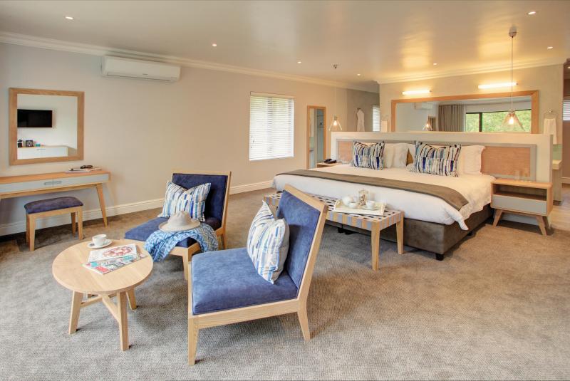LAGEDie gemütliche Anlage der Hollow Kette liegt in fantastischer Lage abseits der Hauptstraße, eingebettet in einer gepflegten Gartenanlage. Die trendige Waterfront und das neue Gebiet Thesen Island liegen nur 5 Fahrminuten entfernt. Der nächstgelegene Flughafen George ist nach 68 km erreichbar. | HOTELDas Knysna Hollow Country Estate wurde bei den verheerenden Waldbränden 2017 gänzlich zerstört und liebevoll von seinen Besitzern neu geplant und errichtet. Das Haus erstrahlt seit seiner Wiedereröffnung im neuen Glanz und besticht mit modernster Einrichtung. Für das Wohlbefinden der Gäste stehen neben der revitalisierten Gartenanlage, 2 Pools mit Garten-Lounges, Restaurant & Bar sowie ein Weinkeller zur Verfügung. Abgerundet wird das Angebot mit WLAN, Fahrradverleih und gesichertem Parkplatz. | ZIMMERDie 44 Garden Suites sind elegant und geschmackvoll ausgestattet und verfügen über Badezimmer, Fön, Klimaanlage, Sat-TV, Mini-Kühlschrank, internationale Adapter mit USB Anschluss, Safe, Nespresso-Maschine und Patio oder Terrasse. |