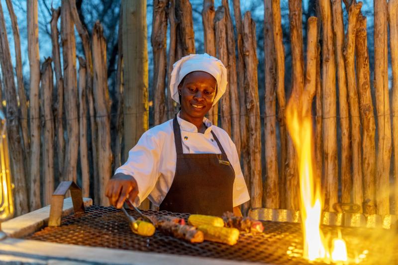 Die Küche des Camps wird durch den beeindruckenden Weinkeller ergänzt. Köstliche Mahlzeiten werden oft unter dem namibischen Sternenhimmel serviert, wobei eine persönliche Note und die Qualität der Zutaten im Vordergrund stehen. Private Bush-Dinners können für ein intimes kulinarisches Erlebnis arrangiert werden.