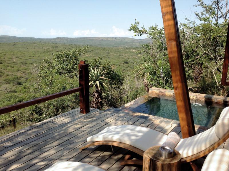 LAGEDie erste private Lodge im Hluhluwe Umfolozi Nationalpark befindet sich in top Lage auf einer Anhöhe und gewährt einen traumhaften Blick auf die Landschaft des Parks. Der nächstgelegene Flughafen Richards Bay ist etwa 2 Fahrstunden entfernt. | HOTELDas ansprechende, moderne Design der Anlage fügt sich perfekt in die natürliche Umgebung ein. Die Gäste werden mit einer Bar, Restaurant, einem Infintiy Pool mit Sonnendeck, Boma und einem kleinen Spa verwöhnt. Von allen öffentlichen Bereichen genießt man einen atemberaubenden Ausblick auf die Weite des Hluhluwe Nationalparks. | ZIMMERDie Zimmer sind im modernen minimalistischen Stil gestaltet und unterteilen sich in Safari Rooms, Bush Villas und 2 Honeymoon Villas. Alle verfügen über Badezimmer, Klimaanlage, Safe, Fön und Terrasse oder Veranda. Die Bush- und Honeymoon-Villen sind geräumiger und zusätzlich mit separater Toilette, Kamin und Minibar ausgestattet. Die Honeymoon Villen begeistern außerdem mit einem privaten Plunge Pool. |