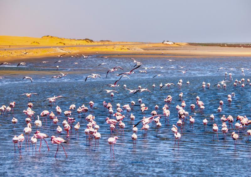 | Weiter geht es an die Westküste nach Walvis Bay, wo Sie ein Mittagessen (optional) genießen und Flamingos beobachten können, bevor es nach Swakopmund geht. Stadtbesichtigung am Nachmittag.
