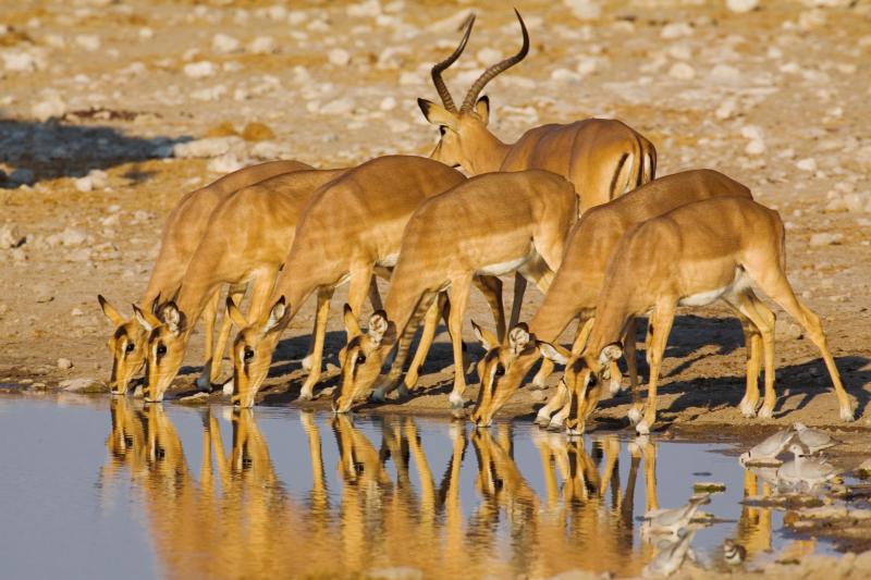 Entlang der Etosha-Salzpfanne befinden sich verschiedene Wasserstellen, die für die Tierwelt von großer Bedeutung sind. Diese Wasserstellen sind oft Treffpunkte für eine Vielzahl von Wildtieren, die ihre Durst löschen und sich erfrischen. Während Ihrer Reise durch den Park werden Sie an diesen Wasserstellen regelmäßig Stopps einlegen, um die Tierwelt zu beobachten und vielleicht sogar seltene oder beeindruckende Arten zu entdecken.