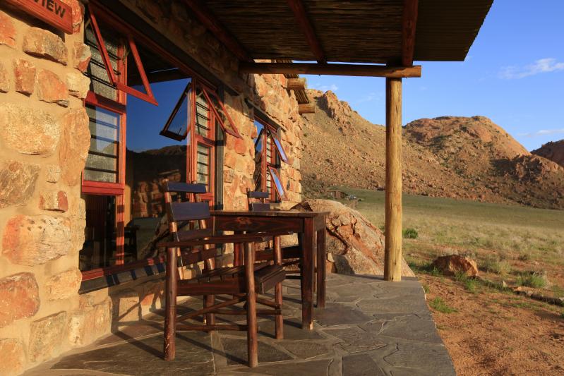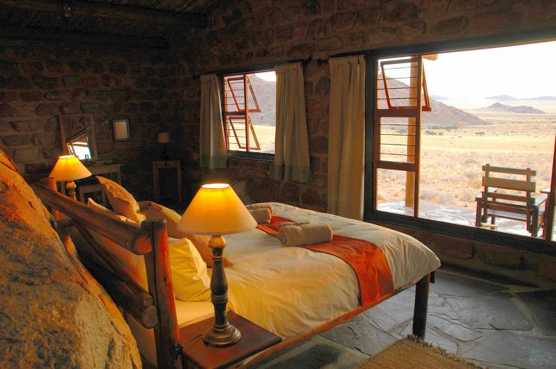 LAGEDas einzigartige Ambiente der Eagle's Nest Chalets eignet sich perfekt für Urlauber, die einfach nur Ruhe suchen. Die Chalets liegen einsam auf einem Berghang, von wo man einen einzigartigen Ausblick in die unendlichen Weiten der Wüste genießen kann. Das Desert Horse Inn, wo die Mahlzeiten serviert werden, liegt etwa 15 Autominuten entfernt. Eagle's Nest ist ein idealer Ausgangspunkt für Ausflüge, beispielsweise nach Lüderitz oder die Geisterstadt Kolmannskuppe. | HOTELDie Chalets des Eagle's Nest liegen am Hang einer Bergkette, von wo aus man die Stille und die prächtigen Sonnenuntergänge über der scheinbar endlosen Wüstenlandschaft auskosten kann. Jedes Chalet ist aus Naturstein zwischen mächtigen Granitfelsen auf dem Hang gebaut. Die Mahlzeiten können im Desert Horse Inn eingenommen werden, oder es können auch Frühstück und Grillpakete von dort mitgenommen werden. In der Umgebung der Unterkunft gibt es eine Vielzahl an Wanderwegen verschiedener Länge, die alle gut ausgeschildert und gekennzeichnet sind. Aber auch Mountain Biker kommen in der weitläufigen Landschaft voll auf ihre Kosten. | ZIMMERAlle acht Chalets sind mit Bad, Kochnische, Kamin und privater Veranda ausgestattet. Zur Wahl stehen Einzel- oder Doppelzimmer. Die Einrichtung ist rustikal und sehr gemütlich gestaltet. |