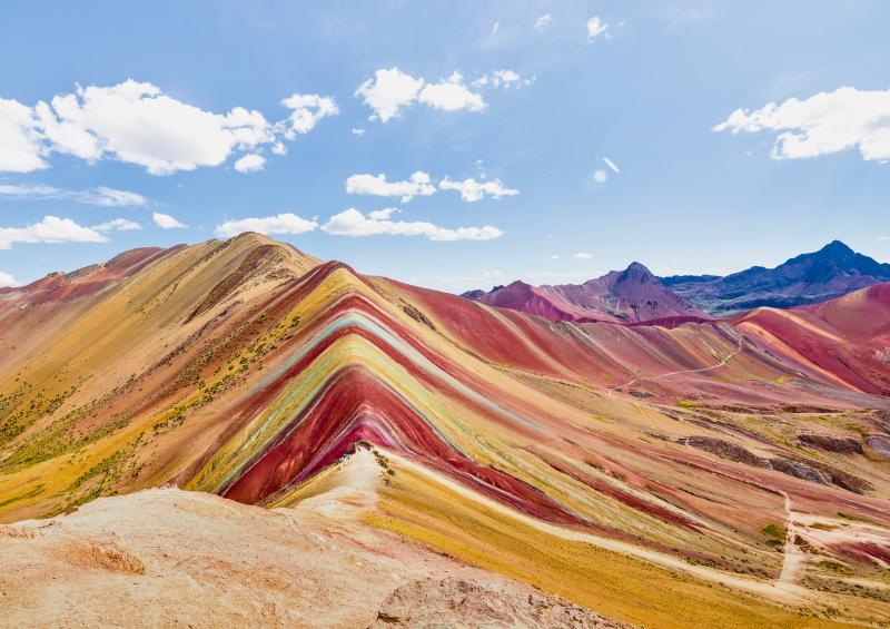 Unternehmen Sie heute einen ganztägigen Ausflug zum Berg Vinicunca, der weltweit als Regenbogenberg bekannt ist, dank seiner auffälligen Farbschichtungen. Bereits am frühen Morgen (gegen 5 Uhr) werden Sie von Ihrem Hotel abgeholt und erreichen nach einer etwa 2,5-stündigen Fahrt den Startpunkt Ihrer Wanderung in der Gemeinde Pampachiri (4.350 m). Dort können Sie den freundlichen Dorfbewohnern begegnen und ihnen etwas Obst überreichen. Nach einem kurzen Einblick in den traditionellen Lebensstil der Einheimischen beginnen Sie Ihre Wanderung. Beim gemächlichen Aufstieg durch das Tal können Sie traditionelle Schäferhütten, grasende Alpakas, Lamas und mit Glück auch die seltenen Vikunjas sehen. Die Landschaft entlang der Strecke wandelt sich allmählich von grün zu roten Farbtönen. Nach etwa 2 Stunden Wanderung durch sandige Täler eröffnet sich ein atemberaubender Ausblick auf Bergspitzen, und Ihre Anstrengungen werden belohnt mit einer herrlichen Aussicht auf den Regenbogenberg (5.020 m) mit seinen türkisen, orangenen, braunen und roten Sedimentschichten. An klaren Tagen können Sie sogar den schneebedeckten Gipfel des Ausangate sehen, mit 6.385 m der höchste Berg der Region Cuscos. Fühlen Sie sich hier wie am Dach der Welt und lassen Sie die eindrucksvolle Landschaft und die Farben auf sich wirken. Ein kurzer Fußweg führt Sie anschließend zu einem Aussichtspunkt über das Rote Tal, bevor Sie auf der gleichen Route zurück zum Fahrzeug wandern (1 Stunde). Nach einer kurzen Fahrt in ein nahegelegenes Dorf erwartet Sie ein Mittagessen im Restaurant La Montana sowie etwas Freizeit, um die einzigartige Umgebung zu genießen, bevor Sie sich auf den Rückweg nach Cusco zu Ihrem Hotel machen (Ankunftszeit ca. 17 Uhr).