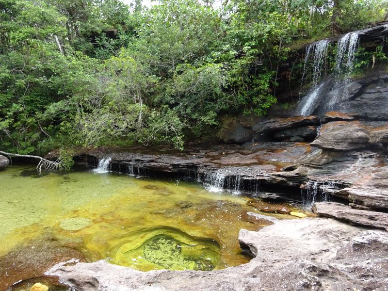 Heute erkunden wir die tiefgelegenen Wasserbecken von Caño Cristales, wo der majestätische Fluss durch den Dschungel fließt und die Wasserpflanzen in intensivem Grün erstrahlen – ein ganz neues, faszinierendes Bild im Vergleich zum Vortag.