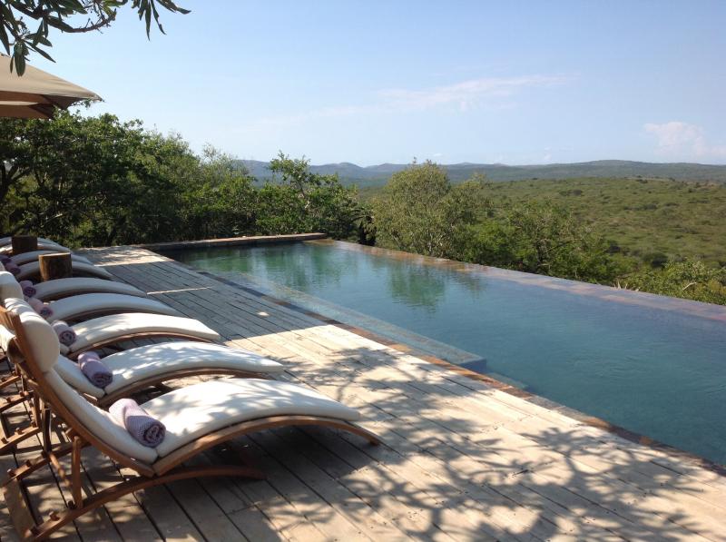 LAGEDie erste private Lodge im Hluhluwe Umfolozi Nationalpark befindet sich in top Lage auf einer Anhöhe und gewährt einen traumhaften Blick auf die Landschaft des Parks. Der nächstgelegene Flughafen Richards Bay ist etwa 2 Fahrstunden entfernt. | HOTELDas ansprechende, moderne Design der Anlage fügt sich perfekt in die natürliche Umgebung ein. Die Gäste werden mit einer Bar, Restaurant, einem Infintiy Pool mit Sonnendeck, Boma und einem kleinen Spa verwöhnt. Von allen öffentlichen Bereichen genießt man einen atemberaubenden Ausblick auf die Weite des Hluhluwe Nationalparks. | ZIMMERDie Zimmer sind im modernen minimalistischen Stil gestaltet und unterteilen sich in Safari Rooms, Bush Villas und 2 Honeymoon Villas. Alle verfügen über Badezimmer, Klimaanlage, Safe, Fön und Terrasse oder Veranda. Die Bush- und Honeymoon-Villen sind geräumiger und zusätzlich mit separater Toilette, Kamin und Minibar ausgestattet. Die Honeymoon Villen begeistern außerdem mit einem privaten Plunge Pool. |