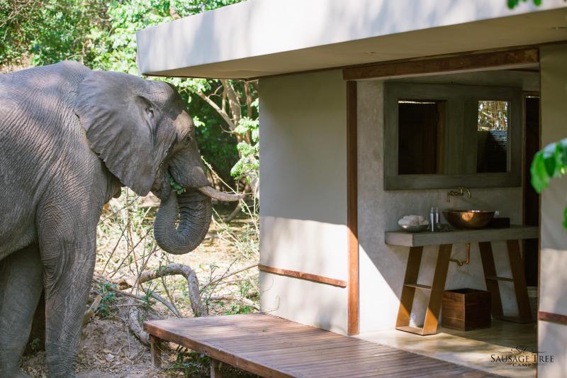 LAGEDas Sausage Tree Camp befindet sich im Herzen des Lower Zambezi Nationalparks. Es liegt ideal, um den Lower Zambezi Nationalpark zu erkunden. Durch diese bietet das Camp nicht nur Wildbeobachtungen an Land an, sondern auch zu Fuß, Boot oder Kanu. Wetterabhängig ist es zwischen April und November geöffnet. | HOTELDas Sausage Tree Camp bietet Platz für maximal 18 Gäste. Die großzügige Anordnung der einzelnen Unterkünfte garantiert Ihnen Privatsphäre während Ihres Aufenthalts. Der zentrale Ess- und Barbereich wird von einer großen Teakholz-Terrasse mit Blick auf den Zambesi umgeben. In der Main Area wird den Gästen bequeme Sitzgelegenheiten, eine Bar und ein 25 m langes Sportbecken geboten. Hier wird gegessen und natürlich ist ein Sundowner auf der Terrasse der krönende Abschluss eines tollen Tages. | ZIMMERDas Camp bietet 7 Luxury Suites und das Kigelia-Familienhaus. Die Luxury Suites verfügen über einen weitläufigen Wohn-/Schlafbereich mit luxuriösem Queensize-Bett, Badezimmer mit Steinbadewanne, Außendusche und einem privaten Tauchbecken. Außerdem können Sie direkt von ihrer privaten Terrasse den Ausblick auf den Zambesi-Fluss genießen. Jedes Zelt hat seinen eigenen persönlichen Muchinda (Butler), der sich um jeden Ihrer Wünsche kümmert. Alle Zelte verfügen über 24 Stunden Strom und reichlich warmes und kaltes aufbereitetes Wasser.Das Kigelia House ist mit zwei Schlafzimmern ausgestattet, die jeweils ein eigenes Bad haben und durch einen offenen Wohnbereich verbunden sind. Dieser führt direkt auf die weitläufige private Terrasse mit Tauchbecken. Ein privater Butler kümmert sich während Ihres Aufenthalts bestens um Ihre Wünsche. |