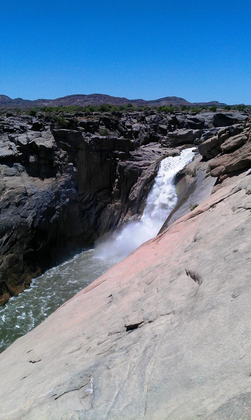 | Am Morgen lassen Sie die Kleine Karoo hinter sich und setzten Ihre Reise zu den Augrabies Wasserfällen, im Norden des Landes, fort. Die Route führt Sie durch üppige Oasen, mit einer Vielzahl von Weingütern. Hier stürzt der gewaltige Orange-Fluss in eine 56m tiefe Schlucht. Der heimische Name für diese majestätischen Wasserfälle beruht sich auf Aukoerebis, was soviel heißt wie Ort des großen Lärms. Am Nachmittag besuchen Sie die atemberaubenden Wasserfälle von mehreren Aussichtspunkten.